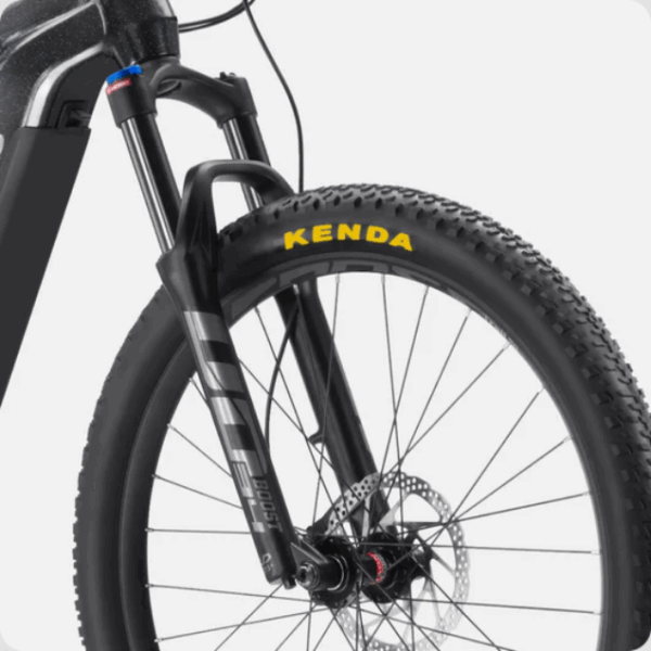 The hydraulic suspension, featuring 120mm of travel and a lockout function, expertly absorbs impacts and dampens vibrations on uneven terrain, elevating comfort, traction, and control for smoother, more secure ride.