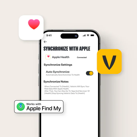 Enjoy a smarter-than-ever ride by using the Velotric App and integrating Apple Health to your ride. Plus, secure your bike with Apple Find My.